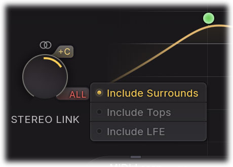 When using Pro-C 3 on a surround track or bus, the first half of the range (from "0% Stereo" to "100% Stereo"), the Stereo Link knob works the same as in the stereo version of the plug-in: it controls the amount of linking between L and R channels (e.g. L/R, Ls/Rs, Lc/Rc or Lts/Rts). However, every stereo pair's linking is still independent of the other stereo pairs.